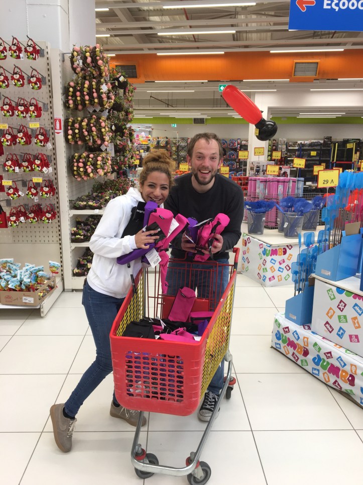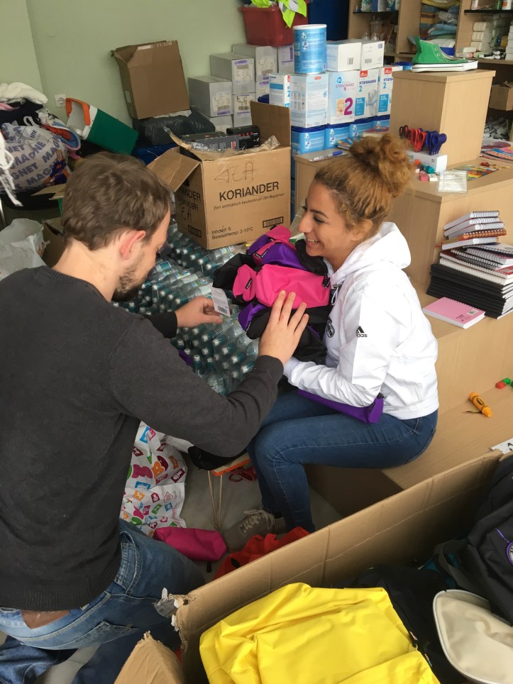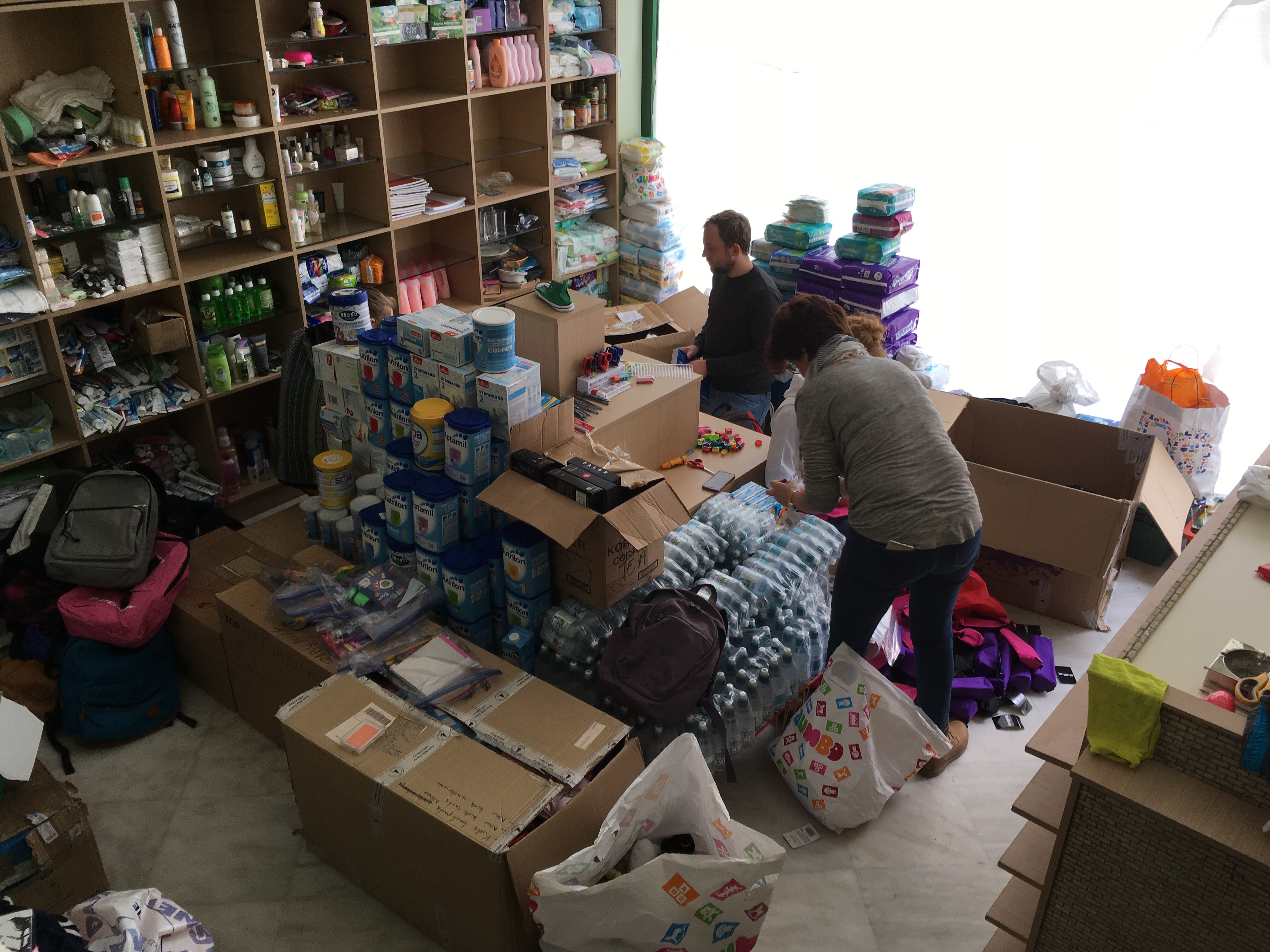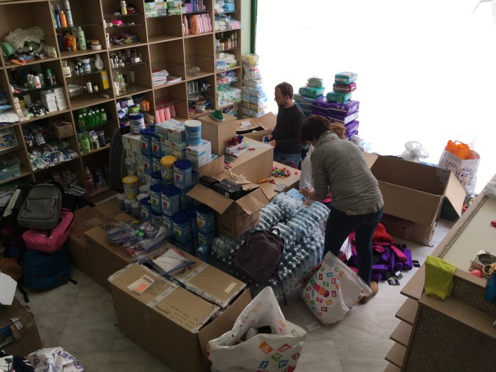 Dimitra hatte uns erzählt, dass in ihrem Warehouse viele Kartons mit Kinderrucksäcken wären, welche sie, bereits fertig gepackt, von einer Organisation bekommen hat um sie in einem Camp zu verteilen. Zu dem verteilen ist es bisher aber nicht gekommen, da es eine Probleme in dem Camp bezüglich der Planung gegeben hatte.