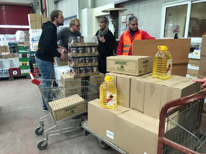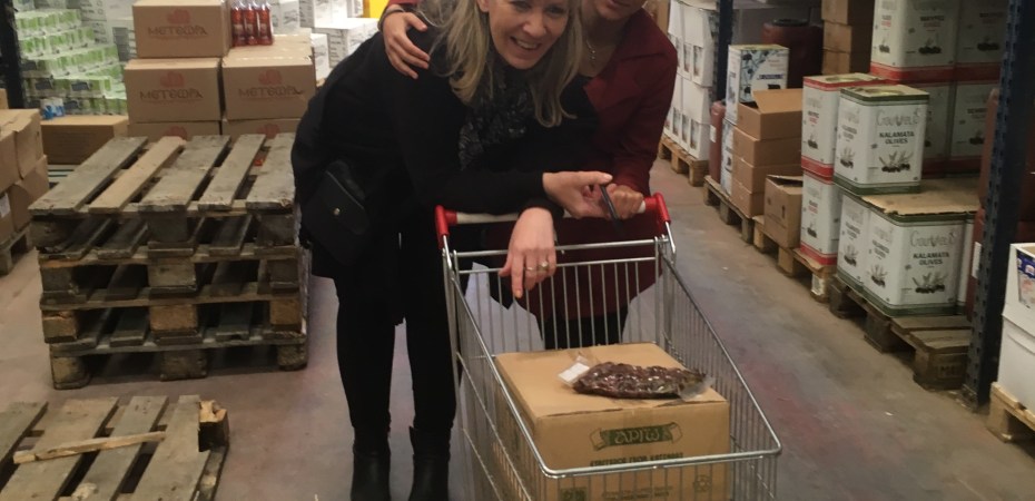 Ziel war es 34 Familien mit etwas besonderen Lebensmitteln zu versorgen, die sie sich natürlich selber nicht leisten können. Am Ende sind wir dann mit zwei vollbepackten und übergroßen Einkaufswagen voller Oliven, Öl und Brotaufstrichen und vielem Anderen aus dem Markt rausgerollt. Anschließen ging es dann in das Warehouse von Dimitra, um die ca. 600 Kilo Nahrung in einzelne Pakete, je nach Bedarf, für die Familien in Sindos zu packen.